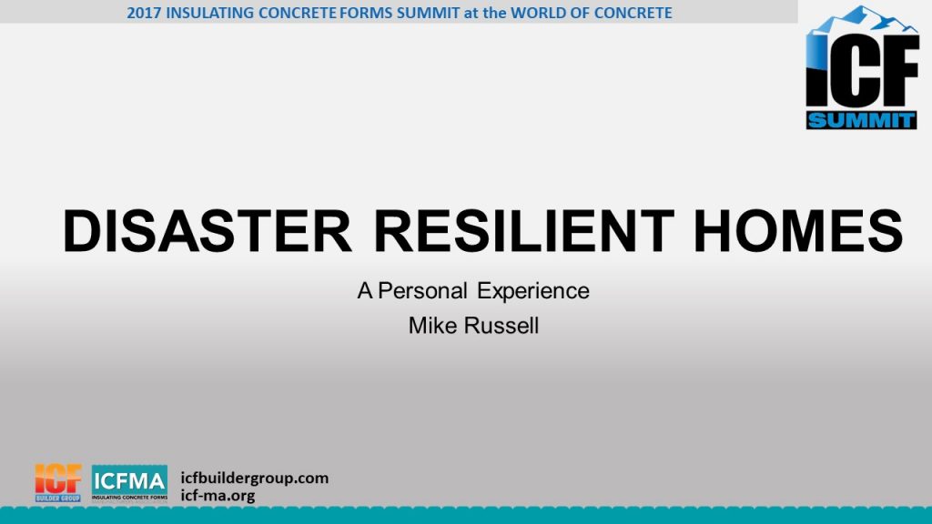 This Disaster Resilient Homes Presentation was created and presented by Mike Russell at the 2017 ICF Summit at the World of Concrete in Las Vegas, NV.