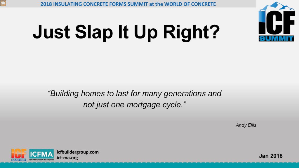 This presentation, Just Slap It Up Right? was presented at the ICF Summit at the 2018 World of Concrete in Las Vegas. It discusses the matierials, design and construction of high performance and disaster resilient homes.
