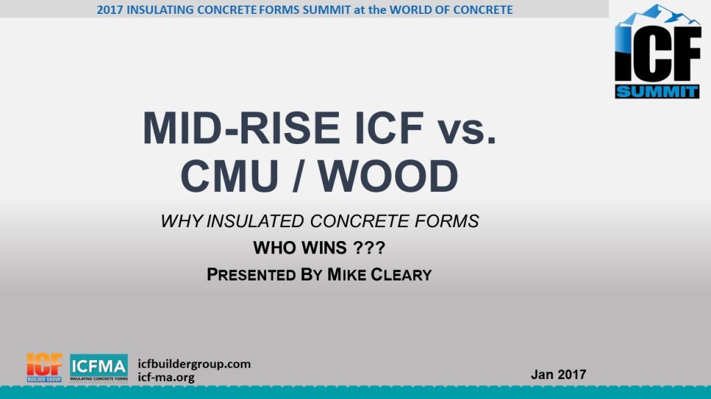 This presentation was created by Mike Cleary to discuss panelization of ICFs, comparison of ICF construction versus CMU and Wood in a mid-rise environment and to demonstrate the significant advantages of helix micro-rebar.